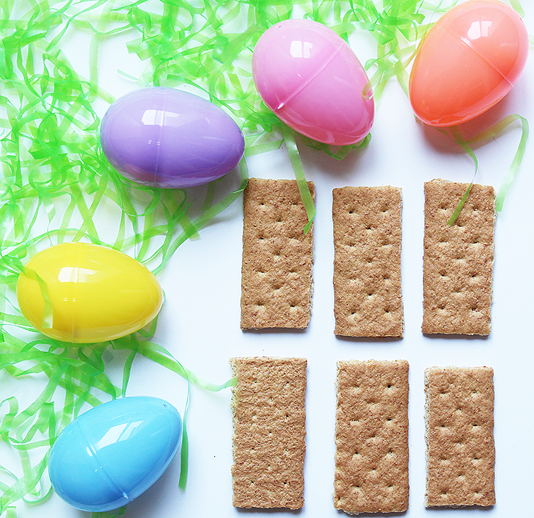 Super Snack Pack pudding cups and a few mix ins, like Honey Maid graham crackers for ears, and some candy and marshmallows for eyes and a nose. I used the graham cracker squares to make the ears of the bunny rabbit since they serve as a great addition to pudding as well. First, you will need to cut each graham cracker block into individual squares.